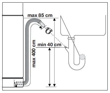 Kontroller at enden af afløbsslangen er placeret min. 40 og maks. 85 cm over maskinens bund eller som anvist i din installationsvejledning eller .