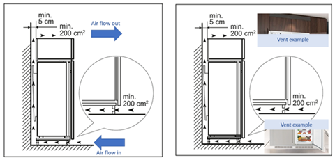 Sørg for, at ventilationskravene er opfyldt. Se installationsvejledningen, der fulgte med dit apparat. Alle køleapparater kræver ventilation for at sikre korrekt drift. Dette er afgørende i tilfælde af integrerede apparater, hvor der kræves ventilationskanaler til dette formål. Nogle gange kan der opstå lyde, fordi apparatets ydeevne påvirkes på grund af utilstrækkelig ventilation Der skal typisk være mindst 200 cm2 ventilation i både toppen og bunden og 5 cm luft bag kabinettet for at tillade korrekt luftstrøm omkring indbyggede produkter. Se krav til ventilation i brugsanvisningen eller installationsvejledningen til dit apparat.
