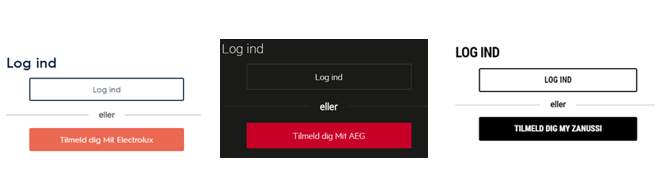 - Kig mod øverste højre hjørne på siden og klik på “Log ind” / “Registrer dit produkt hos Electrolux”. Det ser således ud på de fire hjemmesider: