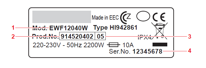 Dataplade med modelnummer, produktnummer (PNC), ELC og serienummer: