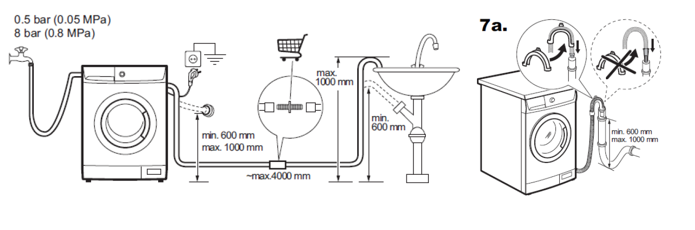 - Enden af afløbsslangen, skal være placeret min. 60 cm og maks. 100 cm over maskinen bund.